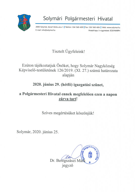 Hétfő: 8:00-12:30; 13:00-18:00 / Kedd: 8:00-12:30; 13:00-16:00 / Szerda: 8:00-12:30; 13:00-16:30 / Csütörtök: 8:00-12:30; 13:00-16:00 / Péntek: 8:00-13:30