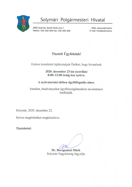 Hétfő: 8:00-12:30; 13:00-18:00 / Kedd: 8:00-12:30; 13:00-16:00 / Szerda: 8:00-12:30; 13:00-16:30 / Csütörtök: 8:00-12:30; 13:00-16:00 / Péntek: 8:00-13:30