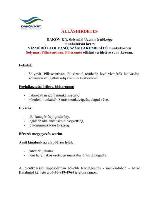 Álláshírdetés: Daköv vízmérő leolvasó munkakör.