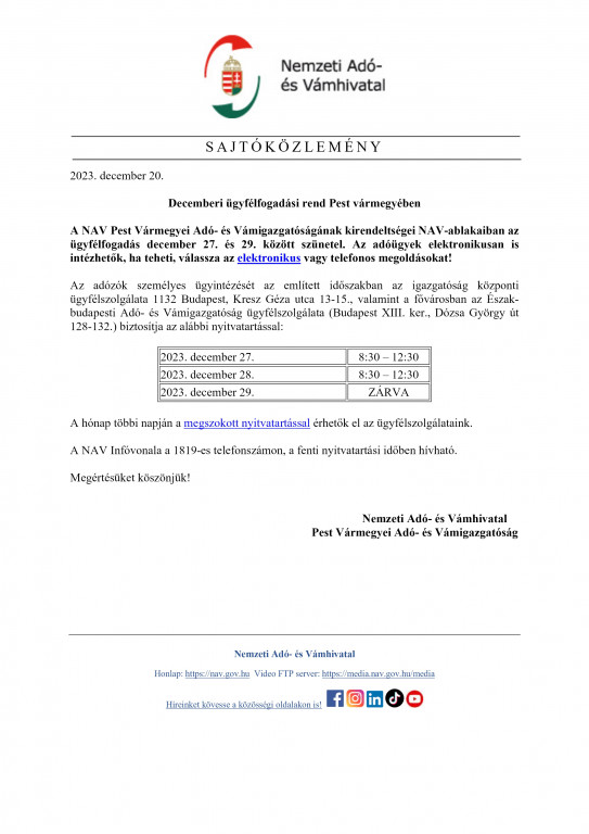 Decemberi ügyfélfogadási rend Pest vármegyében