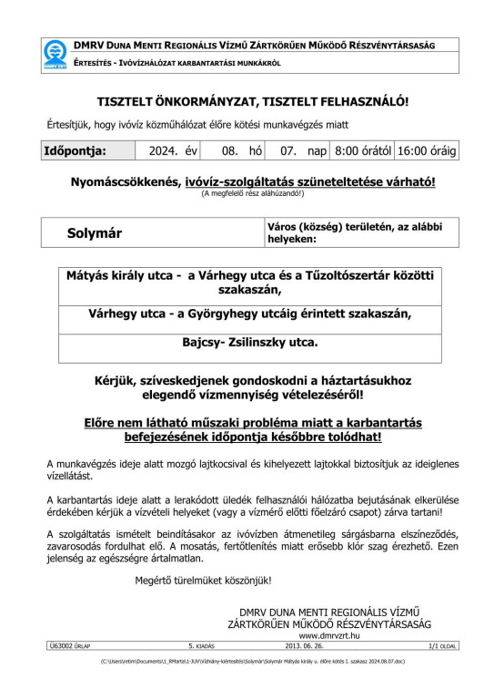 Értesítés vízhiányról 2024. 08. 06. helyett 08. 07-én!