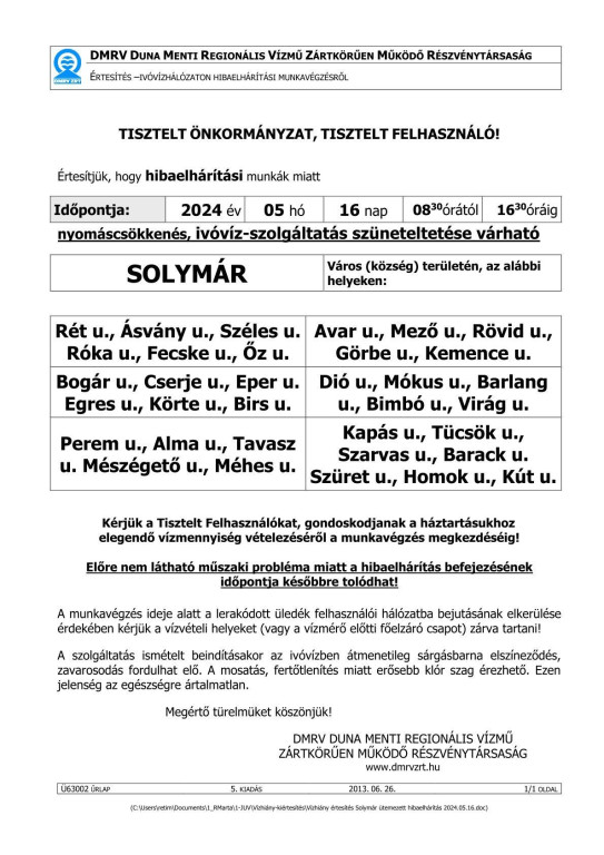 A mai nap (2024.05.15.) 11:29-perckor érkezett, a DMRV Zrt-től kapott tájékoztatás szerint vízhiány várható 2024.05.16-án!