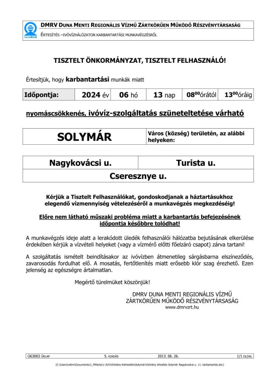 A mai nap (2024.06.11.) 09:16-perckor érkezett, a DMRV Zrt-től kapott tájékoztatás szerint vízhiány várható 2024.06.13-án!