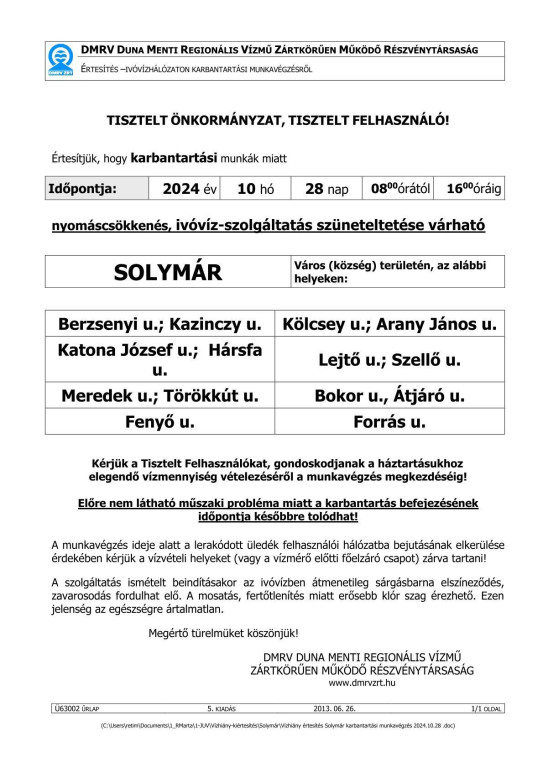 Értesítés vízhiányról 2024.10.28-án!