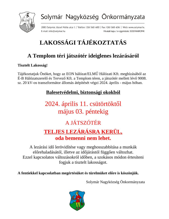 Ideiglenesen lezárásra kerül a Templom téri játszótér!