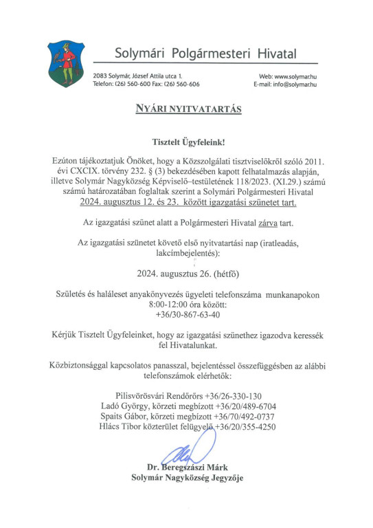 Igazgatási szünet a Polgármesteri Hivatalban!