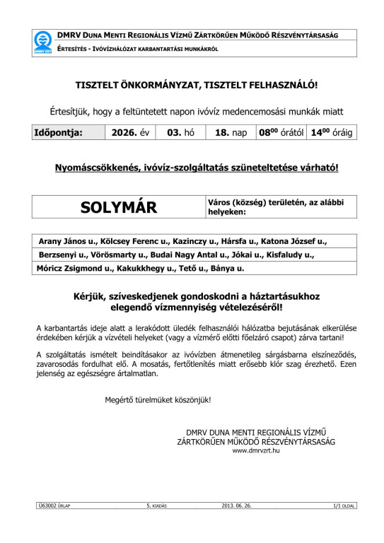 Ivóvíz-szolgáltatás szüneteltetése 2026.03.18-án!