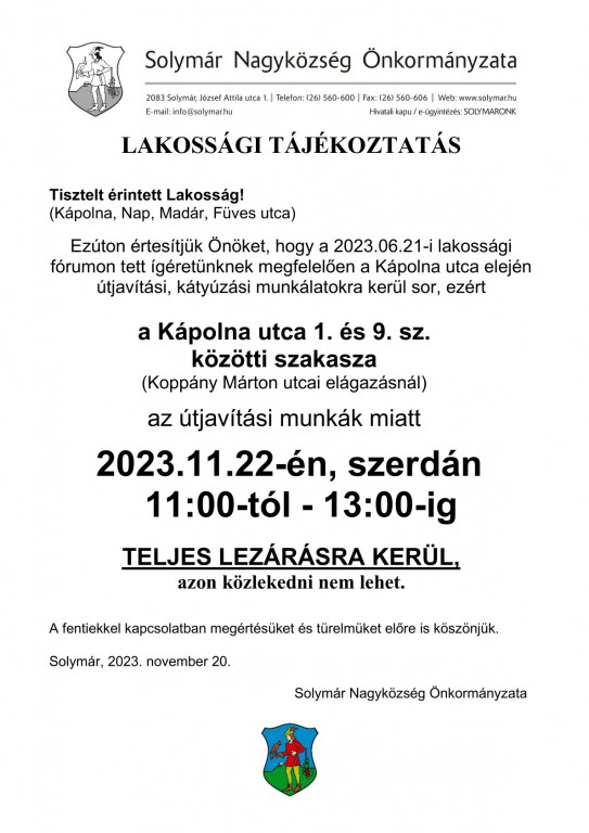 Kápolna utca ideiglenes lezárása kátyúzás miatt!