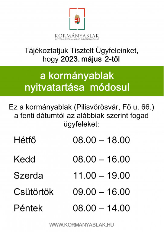 Hétfő: 8:00-12:30; 13:00-18:00 / Kedd: 8:00-12:30; 13:00-16:00 / Szerda: 8:00-12:30; 13:00-16:30 / Csütörtök: 8:00-12:30; 13:00-16:00 / Péntek: 8:00-13:30