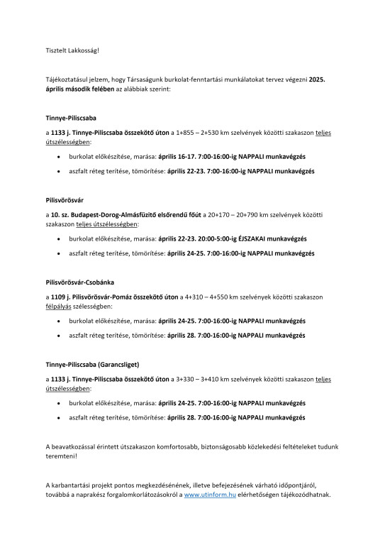 Lakossági Tájékoztatás burkolat - fenntartási munkálatokról!