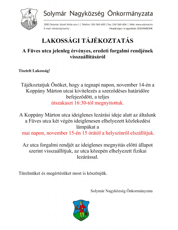 Lakossági tájékoztatás a Füves utca jelenleg érvényes, eredeti forgalmi rendjének visszaállításáról!