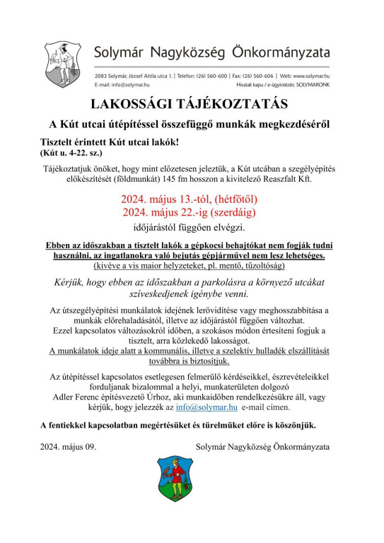 Lakossági tájékoztatás a Kút utca útszegélyépítési munkálatainak megkezdéséről!