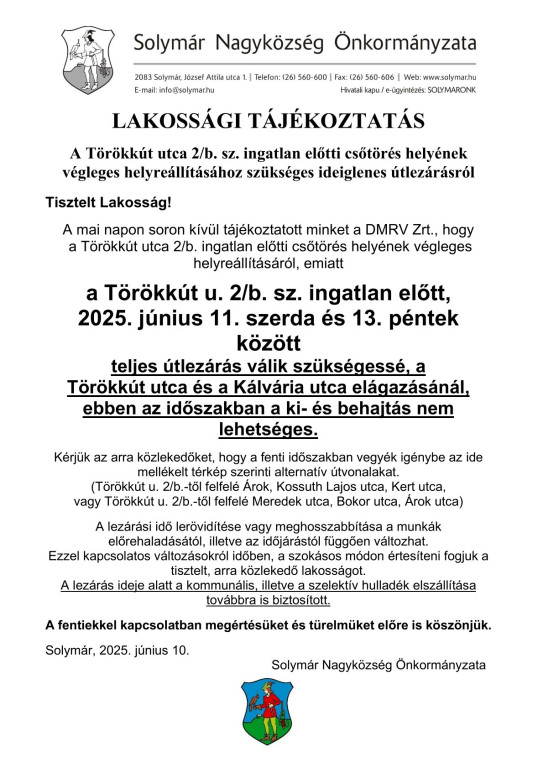 LAKOSSÁGI TÁJÉKOZTATÁS! A Törökkút utca 2/b. sz. ingatlan előtti csőtörés helyének végleges helyreállításához szükséges ideiglenes útlezárásról .