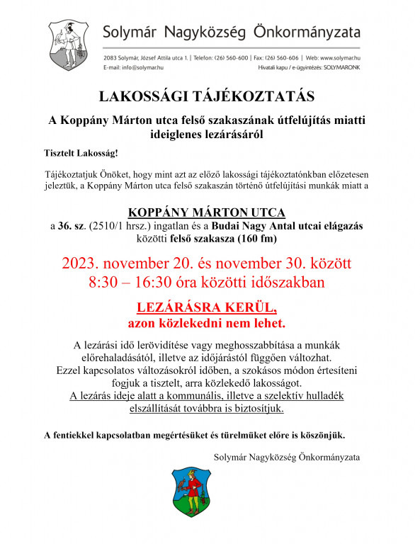 Lakossági tájékoztató a Koppány Márton utca felső szakaszának ideiglenes lezárásáról!