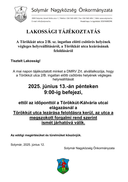 Lakossági Tájékoztató a Törökkút utca lezárásának feloldásáról!