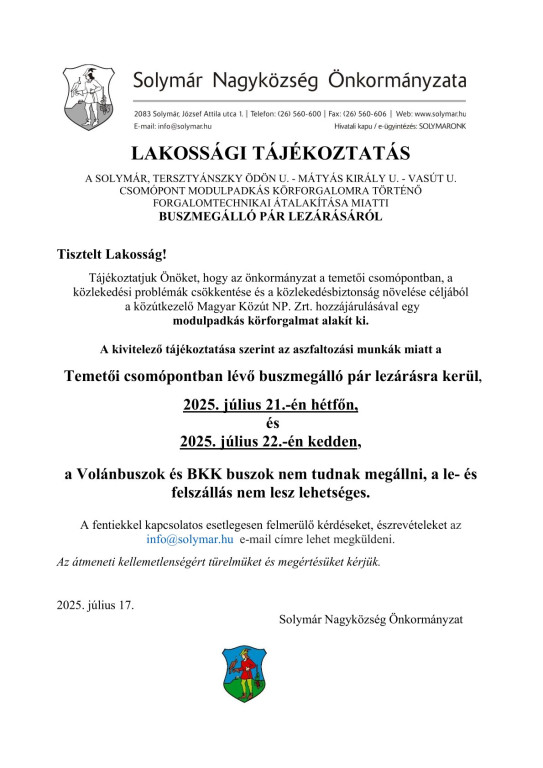 Lakossági tájékoztató a buszmegálló lezárásáról!