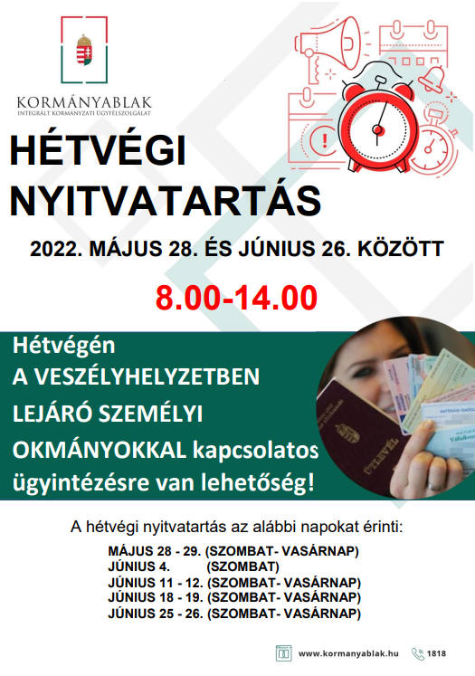 Hétfő: 8:00-12:30; 13:00-18:00 / Kedd: 8:00-12:30; 13:00-16:00 / Szerda: 8:00-12:30; 13:00-16:30 / Csütörtök: 8:00-12:30; 13:00-16:00 / Péntek: 8:00-13:30