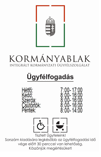 Hétfő: 8:00-12:30; 13:00-18:00 / Kedd: 8:00-12:30; 13:00-16:00 / Szerda: 8:00-12:30; 13:00-16:30 / Csütörtök: 8:00-12:30; 13:00-16:00 / Péntek: 8:00-13:30
