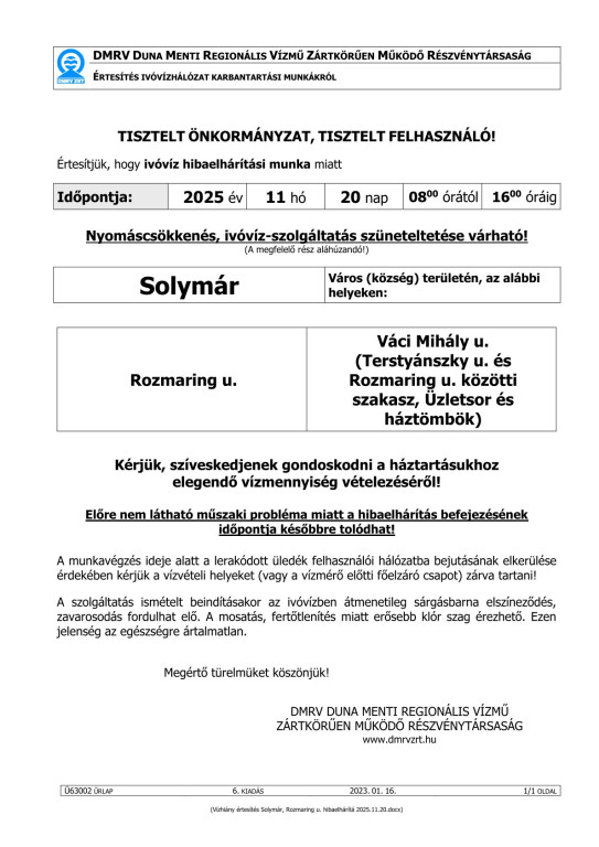 Nyomáscsökkenés, ivóvíz-szolgáltatás szüneteltetése várható 2025.11.20-án!