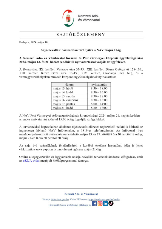 Szja-bevallás: hosszabban tart nyitva a NAV május 21-ig!