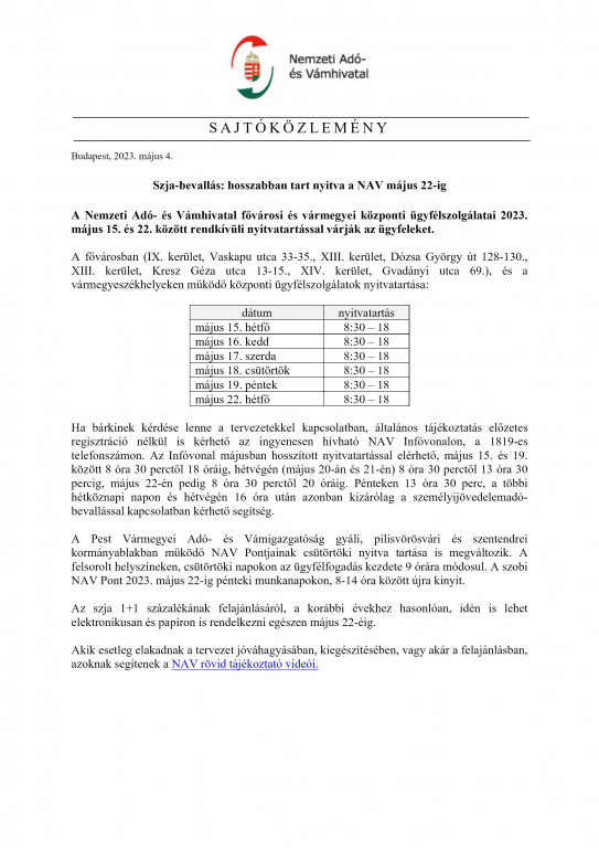 Szja-bevallás: hosszabban tart nyitva a NAV május 22-ig!
