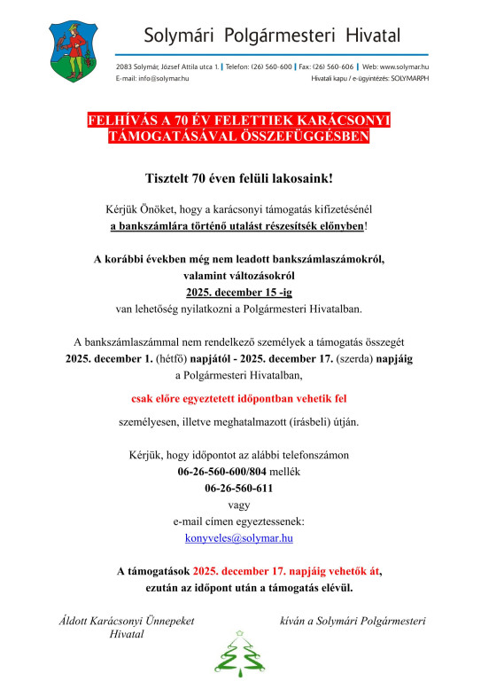 Tájékoztatás a 70 éven felüliek karácsonyi támogatásáról!