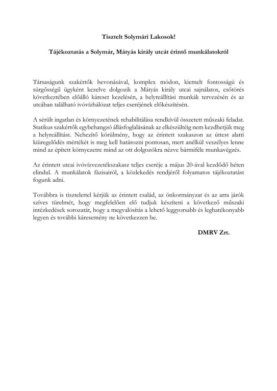 Tájékoztatás a Mátyás király utcát érintő munkálatokról!