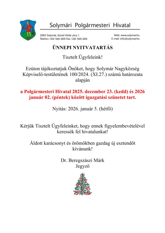 Tájékoztatás igazgatási szünetről a Polgármesteri Hivatalban!
