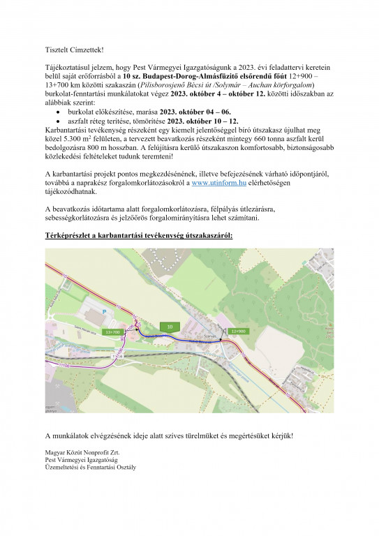 Tájékoztatás munkavégzés megkezdéséről: 10 sz. főút burkolatkarbantartási tevékenység