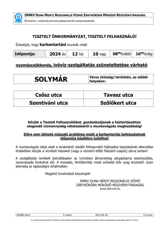 Tájékoztatás vízhiányról 2024.12.06-án és 12.10-én!