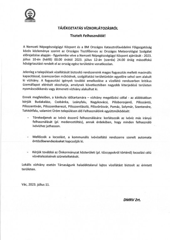 ???? Kérjük, hogy Önök is takarékoskodjanak az ivóvízzel, hogy a kritikus időszakban is fenntartható legyen a szolgáltatás. ????????