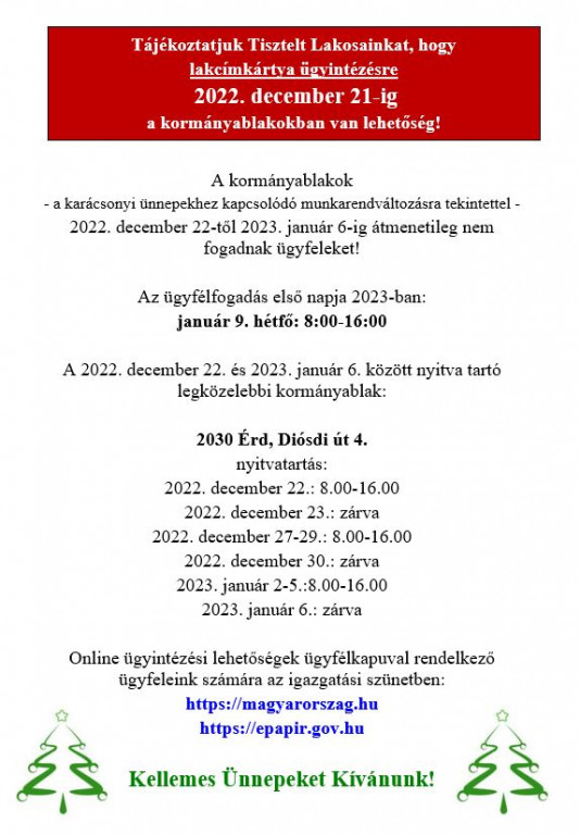 Hétfő: 8:00-12:30; 13:00-18:00 / Kedd: 8:00-12:30; 13:00-16:00 / Szerda: 8:00-12:30; 13:00-16:30 / Csütörtök: 8:00-12:30; 13:00-16:00 / Péntek: 8:00-13:30