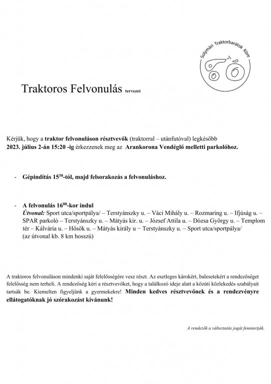 Traktoros felvonulás 2023. július 2-án 16.00 órakor!