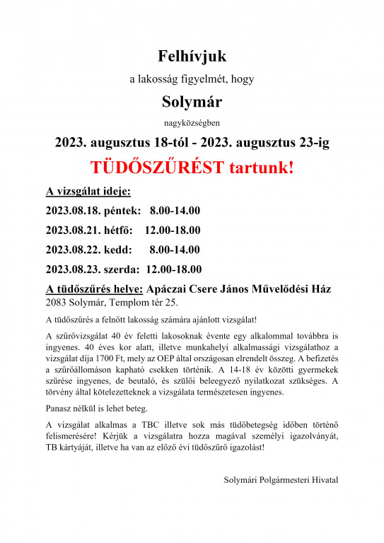 Tüdőszűrés 2023.08.18-2023.08.23. között!