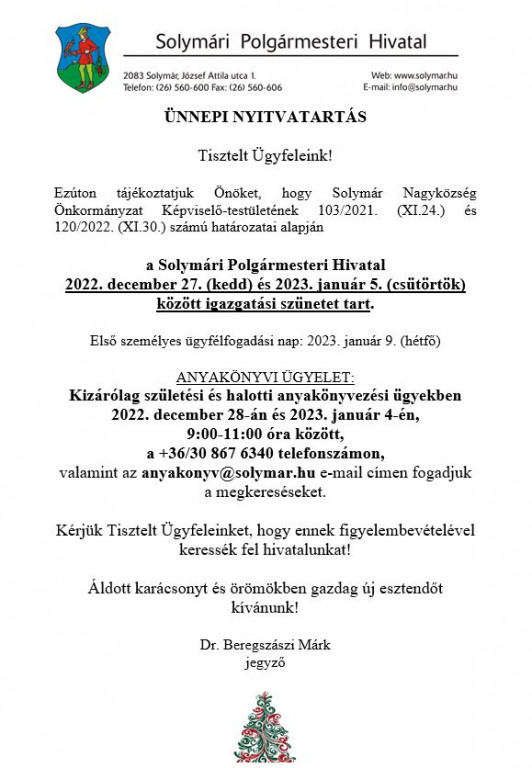 Hétfő: 8:00-12:30; 13:00-18:00 / Kedd: 8:00-12:30; 13:00-16:00 / Szerda: 8:00-12:30; 13:00-16:30 / Csütörtök: 8:00-12:30; 13:00-16:00 / Péntek: 8:00-13:30