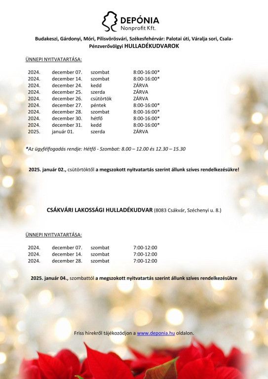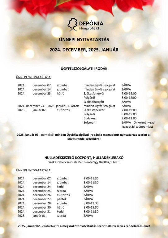 Ünnepi nyitvatartás a Depónia Kft. ügyfélszolgálatain!