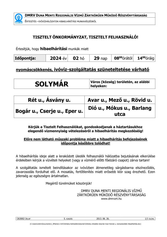 A DMRV Zrt. tájékoztatása szerint hibaelhárítási munkák miatt vízhiány várható az alábbi utcákban: