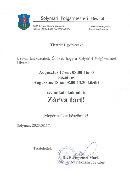 Zárva tartás a Polgármesteri Hivatalban!